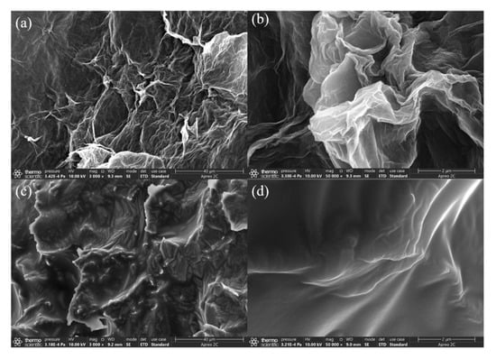 Figure 7a,b shows GA prepared by the Pickering emulsion method at 95 °C under high pressure. It can be found that the pores of graphene oxide folds are uniform and small owing to the use of n-hexane oil droplets as a template for the fold pores. Figure 7c,d shows the PDMS/GA. It is found that the outer layer of the modified aerogel is evenly covered with a layer of silicone rubber. Compared with the first two synthetic products, PDMS/GA composite materials by the Pickering emulsion method can still maintain the pore morphology. This means it can be used as a good oil-absorbing material.
