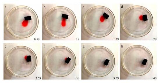 The test chart of the adsorption performance of PDMS modified graphene oxide aerogel on oil red-dyed n-hexane. (a–h) is a photo taken every 0.5 s of adsorption.