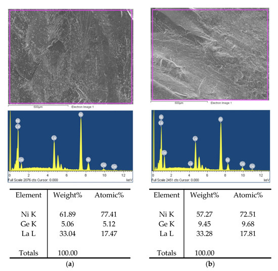 Results of EDS analysis: (a) LaNi4.7Ge0.3 (b) LaNi4.4Ge0.6.
