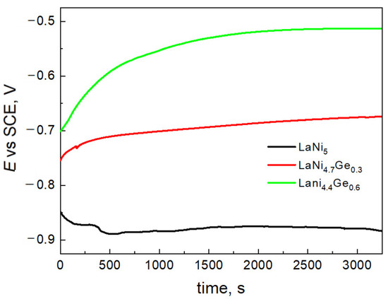 The changes in the open circuit potential (OCP) for LaNi5-xGex solids as a function of time are shown in Figure 3. The potential was measured vs. SCE in a 6 M KOH electrolyte, immediately after the electrodes were immersed in the solution.