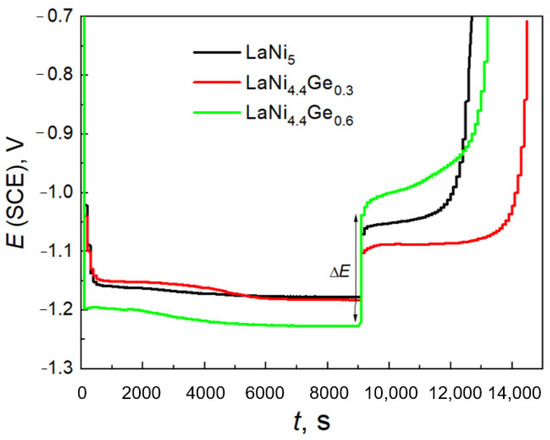 The OCP value at the level of −1.1 V indicates the H2O/H2 equilibrium, that is, it indicates the presence of the reduced form (H2) in the system. The rapid increase in potential (above −1.1 V) is linked to the spontaneous desorption of hydrogen stored in the researched material. The longer the electrode shows a potential close to −1.1 V vs. (SCE), the lower its susceptibility to self-discharge. For an electrode made on the basis of the LaNi4.7Ge0.3 alloy, the open circuit potential increases sharply after 80 h from −1.1 V to −0.97 V vs. SCE, which indicates complete hydrogen desorption and marks the beginning of oxidation of the electrode material. Figure 8 shows that the unfavourable self-discharge process associated with hydrogen desorption is much faster (about 1.5 times) for an electrode based on the LaNi4.4Ge0.6 alloy. From the analysis of work [37] it is known that the equilibrium pressure of hydrogen desorption decreases with the increase in the degree of nickel substitution with germanium in the LaNi5 alloy; therefore, the stability of the hydride is not a factor determining the faster self-discharge process of the LaNi4.4Ge0.6 electrode either. The faster self-discharge of the LaNi4.4Ge0.6 electrode material may be the result of the faster hydrogen diffusivity within the electrode and a lower concentration of hydrogen in the cathodically saturated material.