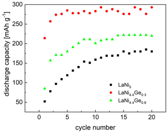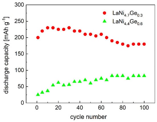 As can be seen from Figure 6, the maximum discharge capacity for the LaNi4.7Ge0.3 -based powder electrode is 293 mAh g−1. Doping the LaNi5 alloy with germanium to the LaNi4.4Ge0.6 composition leads to a decrease in the measured discharge capacity, which is set at 220 mAh g−1. Moreover, the course of changes in the discharge capacity as a function of cycling indicates that the substitution of nickel with a smaller amount of germanium (x = 0.3) leads to faster activation of the alloy. As can be seen from Figure 6, the maximum discharge capacity for the electrode based on the LaNi4.7Ge0.3 alloy is obtained in the 3rd cycle, and for the material substituted with more germanium (x = 0.6) in the 14th cycle, similar to the basic LaNi5 alloy.