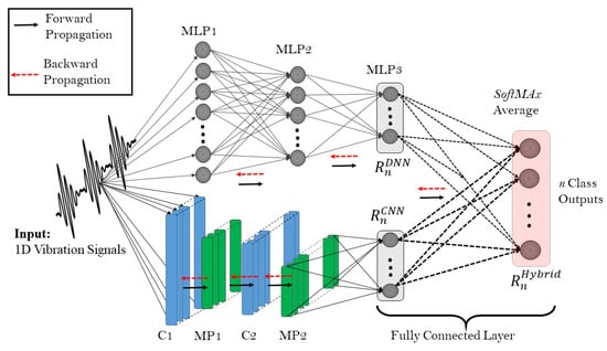 Hybrid models often offer a comparatively better solution than standalone models and with appropriate dynamic modeling processes, their robustness can be explored across diverse disciplines and applications. Their inherent global efficiencies can be well appreciated beyond theoretical validations to changing real-world environments. Particularly, CNNs and DNNs are known for their individual superior discriminative feature extraction and diagnostic capabilities for supervised cases, and have been explored in many works of literature including but not limited to automatic modulation recognition [27], intelligent fault diagnosis for rotating machinery [32], DDoS attack detection [28], and a host of other applications. In this work, we propose a hybrid DNN and one-dimensional CNN diagnostics model which automatically extracts diagnostic features from vibration signals through parallel training and predicts the target labels via SoftMax Averaging at the output layer. Experimental results provide comparative advantages over stand–alone diagnostic models.