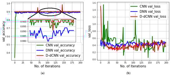 Multiple empirical analyses were performed to confirm the effectiveness of the proposed model. These included a comparison between the proposed hybrid model and its constituent standalone models, past models [4,17] employed for the same purpose, and discussions on the overall investigation/study. Following a successful training and testing (over a 10-fold cross-validation), Figure 3 shows the validation accuracy and losses of the hybrid model and the standalone CNN and DNN models over 200 iterations.