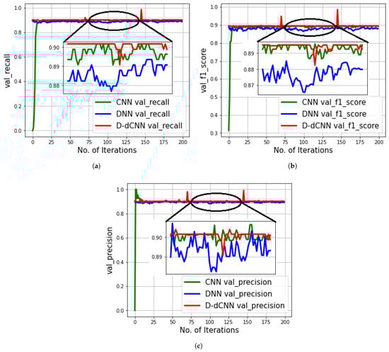 A visual observation of the green, blue, and red lines representing the training history for the CNN, DNN, and D-dCNN models, respectively, the superiority of the D-dCNN model is quite obvious as it returns the highest validation scores throughout the iteration process for recall, F1-score, and precision (see Figure 4a–c, respectively). In addition, it is also observed there are less stochasticity (low variance in the training history plots) from the proposed model unlike the other standalone models. This also hints at the model’s stability—a yet another important criteria for trusting a model for real-life use.