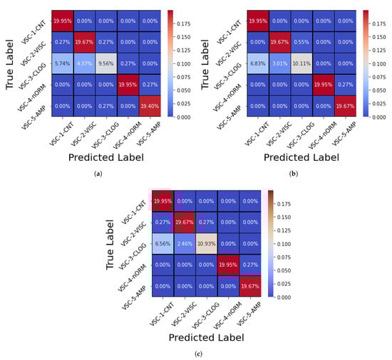 As observed in Figure 4, although the hybrid model (in red lines) retains its superior performance above the other models throughout the the iterations, a closer look at Figure 5c shows there are more false alarms for the pump VSC-3-CLOG with only ≈11% correctly classified samples; nonetheless, this is more acceptable than the and correctly predicted samples produced by the DNN and CNN models, respectively (see Figure 5a,b). A more detailed (averaged) performance evaluation of the models on each operating condition (class) is provided in Table 3.