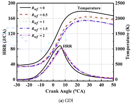 Under the conditions of high ( ≥ 0.8), BSFC is strongly affected by . As postpones from −100 °CA to −30 °CA, BSFC has a sharp decrease of more than 6 g/kWh. Furthermore, this trend becomes more obvious under GDI injection strategy. Because the negative effects on the gas-fuel mixture from the vaporisation process of injected water are a bit stronger under GDI. The variation of BSFC can be attributed to the combustion characteristics, which are presented with , , HRR and in-cylinder temperature in Figure 14 and Figure 15.