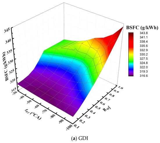 - Under the conditions of ≥ 0.8, BSFC is strongly affected by . As postpones to around −30 °CA, with the improvement in combustion performance, BSFC has a sharp decrease of more than 6 g/kWh, and this decline is more evident under GDI injection strategy.