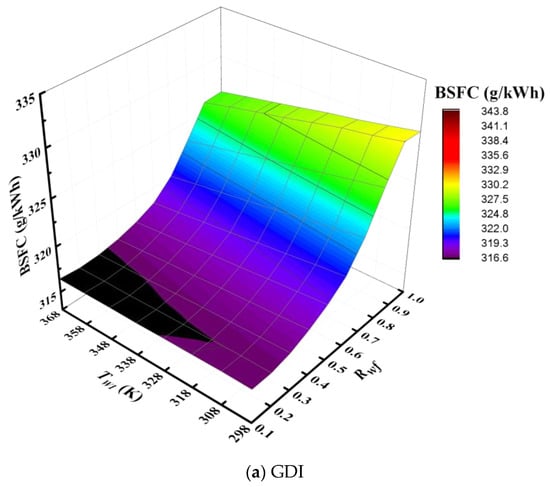 Figure 13 presents the effects of on BSFC under three injection strategies (GDI, P50-G50 and PFI). Meanwhile, is held constant at 298 K in this section.