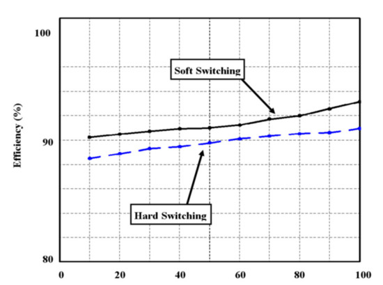- From the experimental results, it can be seen that the maximum efficencies with and without the proposed soft switching are 93.3% and 90.7%, respectively, and the maximum difference in efficiency between the two is about 2.6%.