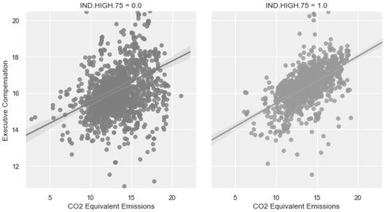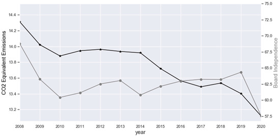 We began with graphical analysis of the key experimental variables and univariate statistical tests to catch the principal associative links between them. Figure 1 presents the intertemporal evolution of board independence and CO2 equivalent emissions (log-transformed) in the energy sector. The computed correlation between the graphed variables is negative after 2010, with board independence on the rise (from 60% to 65%) and the average CO2 equivalent emissions experiencing a slight decrease (ca. −4.3% over a 10-year period) or staying level. It would appear, therefore, that changes in corporate governance may be at least in part responsible for the observed changes in the emitted CO2 levels.