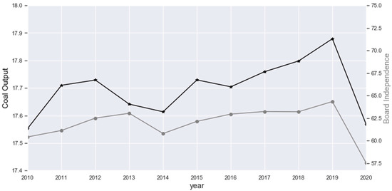 Board independence vs. energy firms’ average coal output (log-transformed).