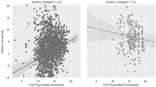 To start with, an analysis of the interrelation between firms’ operational performance measured by return on assets (ROA) and CO2 emissions (Figure 3) clearly suggests that polluters report higher profitability than their less-polluting counterparts. Only in the case of state-owned companies does the relationship appear to be inverted. Thus, it seems that the prevalent cap-and-trade and penalties systems fail to render high-carbon-footprint activities less profitable. That, in turn, undermines incentives to implement environmentally responsible policies. Since the supervisory boards’ primary responsibility is to prioritize shareholders’ interests and aim at value maximization, pushing for implementation of energy transition appears to run against their core duties.