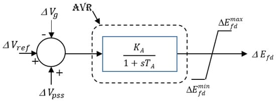 where and are the gain and time constant of the AVR, the reference voltage is , the terminal voltage is and the supplementary signal from the PSS is .
