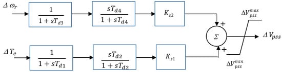 The integration of an automatic voltage regulator (AVR) characterized by a high gain and rapid response in a modern power system induces low-frequency electromechanical oscillations. Also, the power transfer using weak transmission lines, small disturbances such as transmission lines’ parameter variation, sudden small changes in loads, etc., lead to low-frequency oscillations, ranging between 0.2–0.3 Hz [1]. The widely used solution to address low-frequency oscillations is implementing a power system stabilizer (PSS) controller. The primary function of PSS is to increase the synchronous machine damping by adding a stabilizing signal to the AVR [2]. The excitation system’s modulation allows the generation of damping torque in phase with rotor speed variation in the turbine shaft. In power system operation, PSS must produce good effectiveness in damping the electromechanical oscillations. The conventional PSS parameters’ selection problem is solved using a power system model that is linearized. The damping of electromechanical oscillations, especially the inter-area modes, is highly affected by the change of loading conditions and the power system’s topology. In these conditions, PSS is not able to provide satisfactory damping characteristics. Several works have focused on robust PSS via new design techniques or other PSS structures [3].