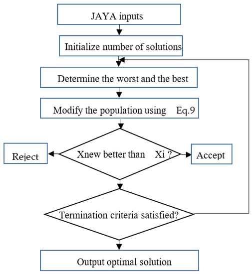 To solve optimization problems, R.V. Rao suggested the JAYA algorithm [27]. The main concern of JAYA is to get the optimal solution by avoiding the worst ones and tending to reach the best. JAYA differs from other optimization techniques in the respect that it is free of control parameters, which means only two common parameters are required, i.e., the number of generations and population size [11].