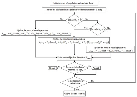 The local search ability of the chaotic JAYA is improved by involving Equation (13). Unfortunately, due to having a huge number of local optima, premature convergence is generally encountered. Therefore, the global optimum cannot be reached. This problem can be addressed when the scaling factor takes its maximum value. In this case, trapping in local optima is avoided, and the overall search behavior of the standard algorithm is enhanced.