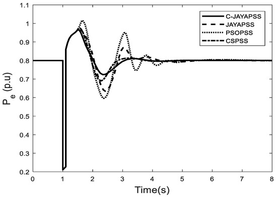 Under severe conditions, the suggested C-JAYAPSS controller’s behavior is verified by applying a three-phase fault with a six-cycle duration at the infinite bus, at the end of one transmission line, over a wide range of loading conditions. The fault clearness is performed without line tripping. The suggested PSS controller’s effectiveness is demonstrated via a comparison to dual-input PSS designed using three well-known techniques: original JAYA, PSO and cuckoo search. The speed deviation of the generator with case1 loading conditions is shown in Figure 8. The system response indicates that the proposed C-JAYAPSS provides good damping characteristics and enhances the SMIB power system’s dynamic stability. The controller tuned by the original JAYA achieves superior damping compared to the PSS and CS methods. Figure 9 shows the electrical output power response. The proposed stabilizers outperform all comparative techniques. The field voltage response depicted in Figure 10 indicates that the control effort is significantly reduced with the design approach. The C-JAYAPSS controller’s ability to dampen electromechanical oscillations under case2, case3 and case 4 loading conditions can be seen in Figure 11, Figure 12 and Figure 13. Despite loading condition variations, the proposed controller provides a good damping performance and remains ranked first among all other comparative techniques.