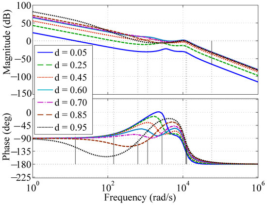 To control this system in closed loop, a proportional integral (PI) controller is used. A PI controller ensures negligible steady state error while ensuring fast dynamic response compared to an integral control [19]. In order to evaluate the performance and stability of a closed loop system, one approach is to analyze the frequency response of its open loop transfer function (OLTF). In the present analysis, this approach is followed by creating MATLAB script files by coding the plant transfer functions using lookup tables as described in the Appendix A. Further, the bode function of the MATLAB toolbox is used to plot the frequency response of the combined controller-plant transfer function. Based on the control theory, a closed-loop system is considered stable when the gain margin (GM) and phase margin (PM) are positive for its open-loop transfer function. To apply this approach in our analysis, we use the frequency response of the OLTF which is the product of the PI controller transfer function along with plant transfer function as described above. In this analysis, the GM and PM are determined for stability and bandwidth is determined for performance or the time response of the closed loop system. Note that in open loop operation, the controller transfer function is not involved. To design the PI controller parameters, the stability and performance are both taken into account here. A is chosen to give nearly 40 phase margin at STC and gives a zero at 100 Hz, which ensures complete phase recovery of 90 at gain cross over. The bode plots of the open loop transfer function at varying duty ratios are plotted in Figure 4.