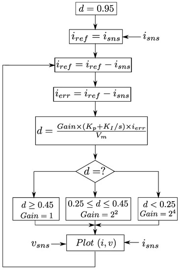 For controlling the input current from zero to short circuit value, its upper limit needs to be evaluated. To get that value in real-time, at the start of the characterization a high duty ratio (d) command is given to the controller and the sensed input current () is noted as reference (). For complete curve tracing, this reference value is reduced in predefined current steps () to trace the compete curve. The gain of the PI controller is decided as per the duty ratio value. PI controller proportionality () and integral gains () remain fixed. The switch PWM duty ratio (d) is determined as the product of the controller gain and the error signal (), which is further scaled down by the sawtooth carrier amplitude (). This entire procedure as represented in the flowchart of Figure 6, sequentially measures the and as the real-time sensed current and voltage of the PV array terminals for complete i–v characterization.