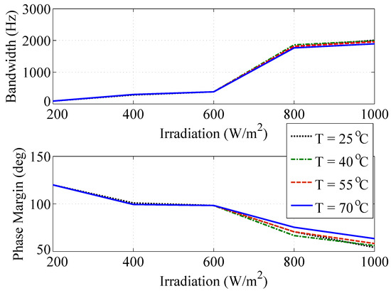 Variation in phase margin and bandwidth with ambient conditions, namely, irradiation and temperature, for maximum power point operation corresponding to 0.6 duty ratio here.