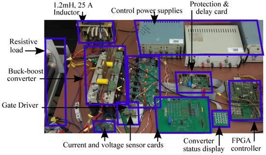 The assembled hardware for the buck-boost SMPC-based PV characterization setup is shown in Figure 9. This system consists of several subsystems, namely, input filter, IGBT (insulated-gate bipolar transistor) based dc-dc converter, gate-drive card, current and voltage protection card, current and voltage sensor cards, FPGA controller board, and converter status display card. The adaptive-gain duty ratio variation control algorithm is coded in VHDL (very high speed integrated circuit hardware description language) and fed to the FPGA (field-programmable gate array) controller for generating PWM (pulse width modulation) signal for the buck-boost converter. The dc-dc converter is designed to work at 20 kHz switching frequency and PV terminal voltage and current signals are sampled at 20 Hz rate. The circuit diagram of the buck-boost converter is shown in Figure 10.