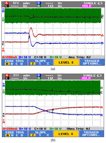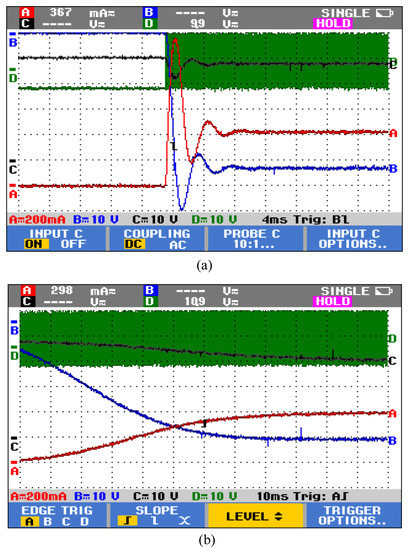 Comparison between the open-loop and closed-loop performance of the characterization setup can be gauged by the experimental step response of the system. When the PV module is connected to the converter, under open-loop operation, the system response shows waveform ringing and oscillations. The percentage overshoot in the open-loop operation is observed to be as high as 100% of its steady state value as seen in Figure 11a. When the response of the closed-loop controller is captured, it is seen to achieve its desired performance as shown in Figure 11b, where PV voltage, current, and output voltage are seen to transition smoothly without any overshoot or ringing unlike open loop operation, as expected from Table 1. An improvement of 100% is observed in PV current overshoot prevention in Figure 11b compared to Figure 11a. Initial startup transitions are also compared for open-loop and closed-loop operations in Figure 12, wherein a 160% reduction is observed in the overshoot of PV current in Figure 12b compared to Figure 12a. This shows that the open loop system settles faster with very high overshoot and ringing as compared to the closed loop operation of the PV characterization set up. The closed loop system has clear advantage in terms of lower overshoot and ringing, with a comparatively slower response, but for PV applications where the fastest irradiance changes are in a few seconds, a closed loop response time of few tens of milliseconds meets the requirement of high speed characterization.