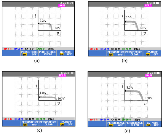 The experimental results validate the high-speed characterization ability with eliminated overshoot and ringing in the closed loop operation as shown in the time response plots in Figure 11 and Figure 12, whereas current-voltage (I–V) plots of Figure 13 show complete short circuit to open circuit characterization under varying ambient conditions captured via real time field characterization of PV array up to 1.2 kW power level. Note that all the reported PV characterization results are with high power polycrystalline PV modules, each rated at 300 W and irradiated with solar irradiation under actual ambient conditions. Due to varying irradiance and PV module temperature owing to passing clouds and wind flow changes, fast characterization at high power levels are needed and has been achieved in this study.