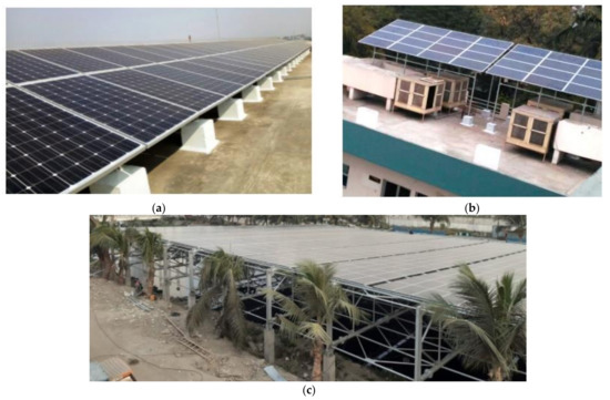 Data for analysis are captured from four plants located at four different geographical locations of India. Particulate matter data of those locations are collected from the website of Central Pollution Control Board (CPCB), Government of India, and weather data are taken from a weather monitoring station [48]. Brief specifications of the four plants are as follows: (i) SPV power plant of Reserve Bank of India (RBI), Kolkata, capacity50 kWp, (ii) SPV power plant of Power Grid Corporation of India Ltd. (PGCIL), Nagpur, capacity 40 kWp, (iii) SPV power plant of Hindustan Petroleum Corporation Ltd. (HPCL), Vishakhapatnam, capacity 100.8 kWp, (iv) SPV power plant of NewTown Kolkata Development Authority (NKDA), Rajarhat, capacity 500 kWp. The data available from the individual plants are used for the validation of the developed model. The details of the PV plants are given in the Table 1 and photographs of the plants are shown in Figure 2.