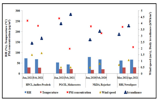 The meteorological data of the four plants at different locations in India during the period of validation of the model are shown in Figure 3. The values of RH, temperature, PM concentration, wind speed and solar irradiance of the four locations e.g., Andhra Pradesh, Maharashtra, Rajarhat and New Alipore are shown in Figure 3. The period of captured data for Rajarhat is January–February 2020, New Alipore is March–April 2021, whereas for the other two places this duration is January–February 2021. The data presented for all the four locations show that the PM concentration is and RH are sufficiently high. Irradiance seems to be better for Maharashtra than the other three locations, whereas the wind speed is more or less similar. Temperature for all the cases varies within the range of ~20–30 °C during the period considered.