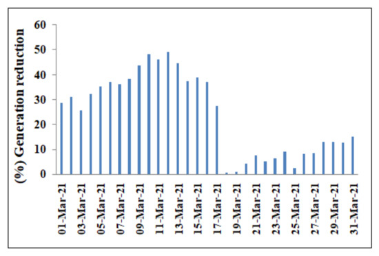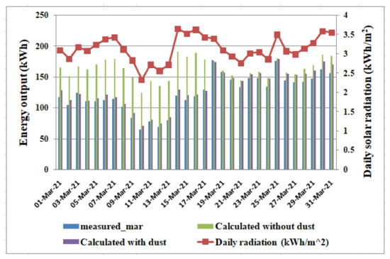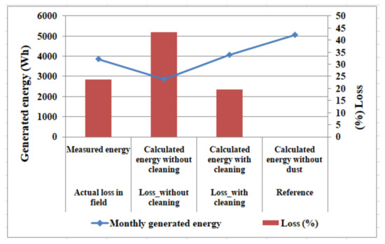 Figure 5 describes the comparison among measured energy, and calculated energy without and with dust from 1 March 2021 to 31 March 2021. Solar irradiance for this one month period is also overlapped in this figure. From Figure 6, it is seen that before the day of cleaning on 17 March 2021, difference between calculated energy without dust and measured one is higher whereas this reduces afterwards. The expected energy generation loss due to dust is 32.2% on 4 March 2021 for the irradiance 3.08 kWh/m2, whereas after cleaning this loss is only 8.15% on 26 March 2021 for almost the same radiation 3.07 kWh/m2.