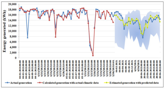 A comparison is made between the actual generation and predicted generation with forecasted weather data for one month (from 1 June 2021 to 30 June 2021) which is shown in portion ‘bc’. The model based predicted generation for the month of June 2021 is obtained with the solar radiation data with 50% probability of occurrence. The generation scenario ranges from 10% probability of occurrence (lower profile of the shaded portion) to 90% probability of occurrence (upper profile of the shaded portion) of solar radiation along with other forecasted weather parameters. The actual generation exhibits a good match with the predicted one (portion ‘bc’) during the calculation period.
