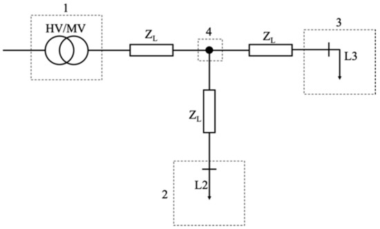 Figure 1 shows a 4-nodes structure in which Node 1 is the high to medium voltage transformer (HV/MV); Node 2 and Node 3 are passive nodes with variable loads (L2 and L3, respectively) which can be considered as simple customers or secondary substations; and Node 4 is a conjunction node in which all the currents of the circuit pass through. Finally, ZL is the line impedance modeled with the series of a resistor and an inductor (R-L impedance). Such a choice is the common one for DNs.