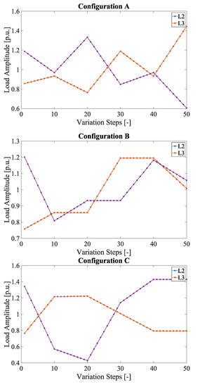 Considering the 15 min interval between the outputs of the RGDM, the load profiles have been set with one limited variation every 15 min for 50 times. The load variations involve both the active and reactive parts so that the PF is kept constant for the entire simulation, as explained above. L2 and L3 have different load profiles to increase the coherence of the simulation with reality. To run the tests, three pairs of load profiles, referred to as A, B, and C have been used. They are depicted in Figure 3. As can be seen, the p.u. notation is adopted to focus on the load variations, which are diverse, and include several potential cases.