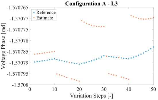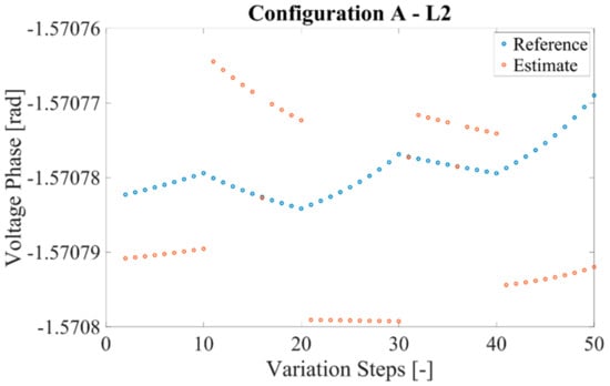 The main results are presented in Figure 5, Figure 6, Figure 7 and Figure 8, in which the estimated voltage phase in nodes 2 and 3 is compared with the reference voltage phase obtained from the simulation model. Considering the coherence among the results, for case A both results are shown in Figure 5 and Figure 6, while one case for each configuration has been included for configurations B and C (Figure 7 and Figure 8). In detail, the voltage phase of L3 is presented for configurations A, B, and C, in Figure 6, Figure 7 and Figure 8, respectively.
