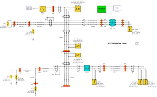 An overview of the Simulink schematic representing the IEEE 13-bus test feeder is depicted in Figure 9.