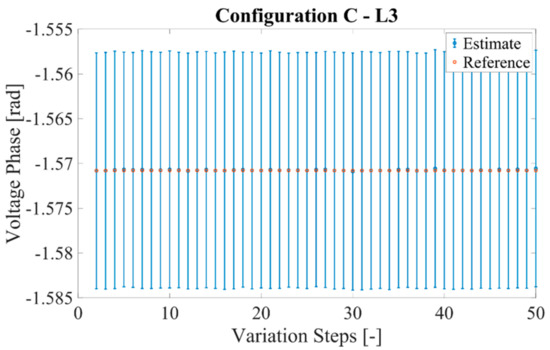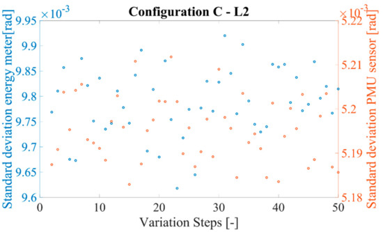 The application of the MCM to the A, B, and C configurations, described in Section 4.1.2, provided interesting results. The mean standard deviation associated with the phase obtained from the PMUs was in the order of 5·10−3 rad and the one computed starting from the powers is in the order of 10−2 rad. In Figure 10 their behavior is presented, for the sake of clarity, for the configuration C and load L2.