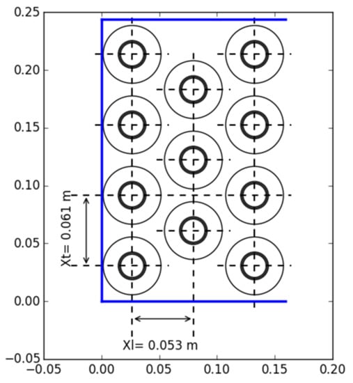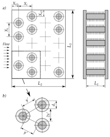 Finned heat exchanger tube arrangement: (a) airflow through the heat pipes, (b) minimum airflow area (according to []).