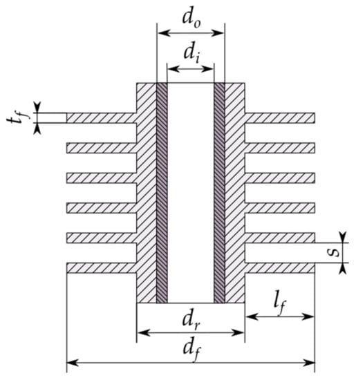 The geometry of the finned tube was chosen to ensure the ease of HPHE prototype manufacture. It was selected from the bimetallic high-finned tubes manufacturer catalog—CEMAL company []. Heat exchanger channel height was L1 = 0.245 m (a consequence of finned heat pipe geometry), and width L3 = 0.245 m was a result of the assumption of a square channel. Geometrical parameters of the finned aluminum tube applied on the standard copper tube: ø 22 × 1 mm are given in Table 2 and presented in Figure 6. Fins were cold-rolled on the outer aluminum tube.