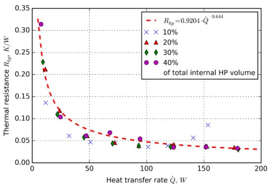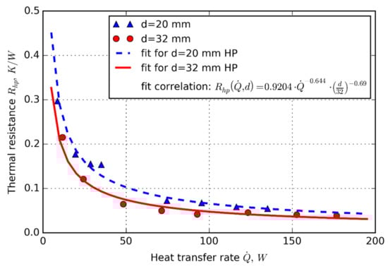 Thermal resistance vs. heat transfer rate for 20% filling ratio, for d = 20 mm, and d = 32 mm HP. Experimental data were fitted with (25) [].