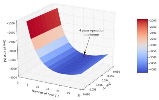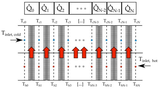 The computational model uses Equations (1)–(25) for the iterative calculation of heat transfer rate, and air streams outlet temperatures. The initial value of the heat transfer rate is guessed and after each iteration, it is updated until the residual becomes lower than 1 W. The iterative technique to solve the non-linear set of equations is the Gauss–Seidel method with an under-relaxation factor of 0.4. This algorithm is used to find a solution (heat transfer rate) for every HPHE row. The HEX is divided into control volumes according to Figure 5. Nodes were at the inlet and outlet planes to each row. Each node represents an unknown temperature, besides the known values at the inlets (blue nodes for cold air temperatures: Tc0–TcN, red nodes for hot air temperatures: Th0–ThN). After all of the temperatures and heat transfer rates were updated, and the maximum residual of all of the temperatures is calculated. If it is not lower than 0.001 °C the temperatures and heat transfer rates are updated again. The iterative technique is also Gauss–Seidel but without the under-relaxation.