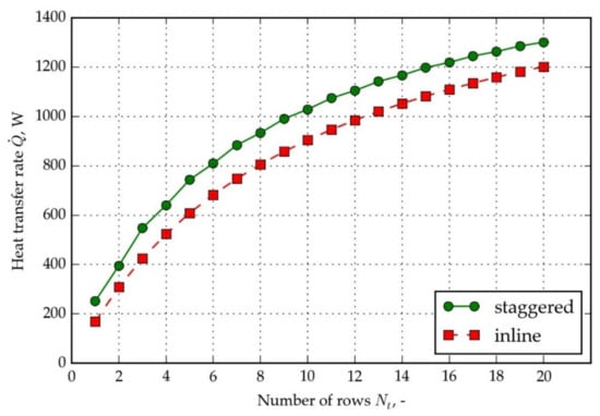 Heat transfer rate for inline vs. staggered heat pipe arrangement, for inlet cold air temperature 10 °C and hot air inlet temperature 30 °C.
