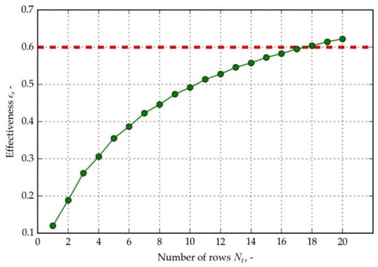 Thermal effectiveness of HPHE as a function of number of rows, for inlet cold air temperature 10 °C and hot air inlet temperature 30 °C.