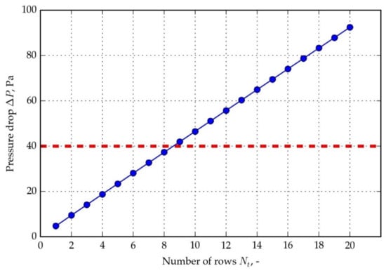 The initial arrangement of finned heat pipes is shown in Figure 7 (three first rows). It is a start positioning for the further thermal and flow analysis carried out with the use of the computational model. This arrangement is considered for the first set of plots: Figure 8, Figure 9 and Figure 10. Volumetric flow rates for hot and cold airstreams are held constant (300 m3/h). Inlet cold air temperature is kept at 10 °C and hot air inlet temperature at 30 °C. The counterflow arrangement was chosen as it produces a higher mean temperature difference between streams than parallel flow. A staggered HPs arrangement was also selected over the inline as it ensures better mixing and temperature uniformity of air streams. Initially, the isosceles layout was assumed due to a minimal pressure drop []. Figure 8 shows the heat transfer rate for inline and staggered finned HPs arrangement as a function of the number of HPHE rows. It is a validation of the correctness of the computational model calculations. As expected in the whole, considered range of the number of rows, the staggered arrangement produces a higher heat transfer rate than inline. As the number of rows increases, thermal effectiveness grows non-linearly (Figure 9)—the shape of the function is similar as in the case of heat transfer rate. The previously stated goal is 60% effectiveness (red horizontal line), and it corresponds to a 17-rows HPHE. Because of thermal calculations uncertainty, 20 rows were chosen (three extra rows) to obtain the assumed effectiveness. Pressure drop increases linearly with the number of rows and exceeds 40 Pa at approximately nine rows (Figure 10). For 20 rows HPHE, ∆P of 100 Pa is not exceeded, which makes that acceptable value for small air conditioning systems (it can be handled by a typical air duct fan). Further increase in effectiveness by adding more rows (more than 20) is not viable, because the addition of two rows produces approximately 10 Pa extra pressure drop (which is 10% relative increase) while only 2–3% raise of effectiveness. It supports 20 rows as the final choice, taking into account that a pressure drop increases linearly, while the effectiveness slope becomes less steep for increasing row number (adding more rows becomes even less viable in terms of effectiveness vs. ∆P change as row number increases).