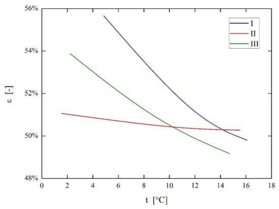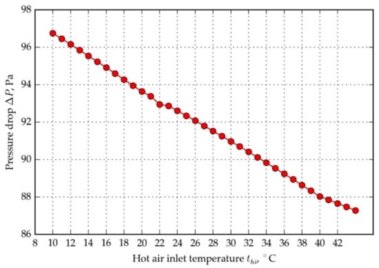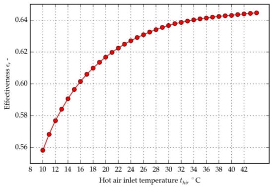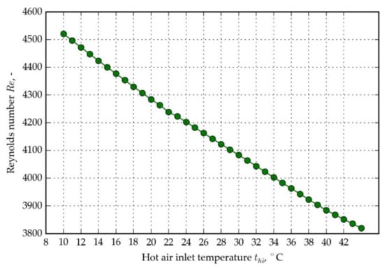 The dependence of parameters on hot air inlet temperature is shown in Figure 11, Figure 12 and Figure 13. All computations for the plots were made with the assumption of 20 HPs rows and 0 °C cold air stream inlet temperature. Figure 11 shows the dependence of the Reynolds number, which is decreasing for increasing hot air inlet temperature. It is an effect of an increase in air kinematic viscosity with temperature. There is approximately a 15% Reynolds number decrease relative to the value for the lowest considered temperature: 8 °C. Figure 12 presents the pressure drop as a function of the hot air inlet temperature. The pressure drop decreases linearly by 10% for the assumed temperature range—it is caused mainly by a decrease in air density with temperature. The combined effect of air thermophysical properties changes with temperature (variation with pressure is negligible) and mean temperature rise impacts HPHE effectiveness, yet very weakly for hot air temperatures greater than 30 °C (Figure 13). The relative change from 30 to 42 °C is just a fraction of a percent. The above analysis shows that the assumption of approximately 60% effectiveness is valid for a broad range of temperatures for 20 rows of HPHE. There is a potential benefit in reducing a pressure drop for higher temperatures, although it is calculated for a constant volumetric flow of air, which could decrease in a real situation, where a fan is inducing the flow. The working point of a fan can change for lower air density and flow conditions could vary.