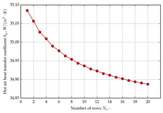 Hot air heat transfer coefficient vs. the number of rows, for hot air inlet temperature 30 °C and cold air inlet temperature 10 °C.