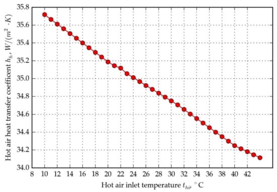 Hot air heat transfer coefficient vs. hot air inlet temperature, for cold air inlet temperature 0 °C.