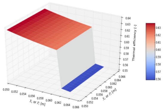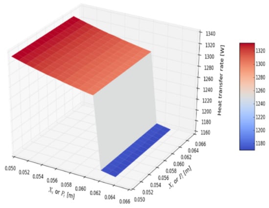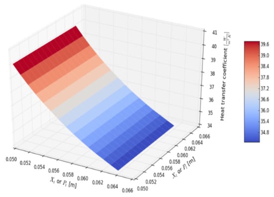Figure 14 shows hot air heat transfer coefficient dependence on the number of rows (inlet hot air temperature: 30 °C, inlet cold air temperature: 10 °C). The computational model allows very small dependency of the heat transfer coefficient as equation (15) is valid for the number of rows greater than six; therefore, the calculated heat transfer coefficients for a smaller number of rows are uncertain. This inaccuracy, however, is not very important, as the practical number of rows which produces reasonable HPHE efficiency (ε > 50%) is greater than 10. The dependence of the hot air heat transfer coefficient on the hot air inlet temperature, for cold air inlet temperature 0 °C, is shown in Figure 15. For the broad range of temperatures, heat transfer coefficient changes only slightly—it drops by 5%. This proves the stability of the working point of HPHE under various temperature conditions. Three-dimensional graphs are introduced for defining the optimal spacing between the center of the tubes—longitudinal and traversal in the respect to the airflow direction. The subsequent analysis was carried out with an assumption of constant hot and cold air inlet temperatures (10 and 30 °C). Figure 16 presents the exchanged heat transfer rate as a function of traversal and longitudinal spacings. Heat transfer rate changes stepwise at Xt = 0.062 m because below that spacing it is possible to add one extra HP in the row. Further decrease in traversal distance results in weak growth. At minimal traversal spacing Xt = 0.05 m (contact of finned HPs), heat transfer rate attains the maximal value. Longitudinal spacing does not affect the heat transfer rate. HPHE effectiveness, shown in Figure 17, exhibits similar behavior to heat transfer rate, with the peak value of 64% for minimal traversal spacing. The pressure drop rises more sharply with the decrease in Xt than with the reduction in Xl. As longitudinal spacing does not affect heat transfer significantly, moving away HPs in the longitudinal direction is advised, yet excessive spacing could cause an unacceptable increase in the total length of HPHE. The peak of a pressure drop is noted for minimal spacings (approx. 160 Pa).