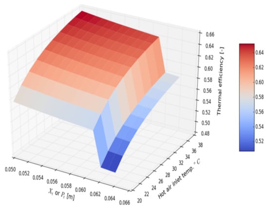 The hot air heat transfer coefficient grows by 20% with traversal spacing reduction (Figure 18). Enhancement by altering the Xl is negligible. Figure 19 presents the dependence of HPHE effectiveness on Xt and hot air inlet temperature. A maximal value of 66% is attained for minimal Xt and the maximal temperature difference between hot and cold airstreams. As expected for higher temperature differences, HPHE performs better.