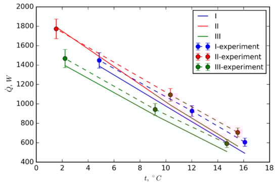 The thermal resistance of the wickless heat pipe is taken from the regression of experimental data from previous authors’ work [], where the thermal performance of various diameters of wickless HPs were investigated for different working fluids filling ratios. The experiment parameters are summarized in Table 1. Various diameters of HPs were tested to obtain thermal resistance characteristics. On the condenser and evaporator sections of HPs, jacket HEXs were installed. The condenser section HEX was fed with cold water, while through the evaporator section HEX hot water flowed. Because of the low volumetric flow of cooling and heating water, the range of heat fluxes obtained for HPs was nearly identical as predicted in the case of the air-to-air HPHE. The lower convective heat transfer coefficients of the air were compensated for by the area enlargement due to the finned surface (the enlargement factor was around 20). The other aim of the study was to choose the best working fluid of the examined substances. Refrigerant R404A was recognized as the best working fluid (giving the highest thermal throughput) from other tested fluids (R134a, R410A, and R407C). A twenty percent volumetric filling ratio was chosen consecutively as the best of four considered in the study (10%, 20%, 30%, and 40%). Thermal resistance versus heat transfer rate for a 32 mm outer diameter heat pipe is shown in Figure 3. The relative uncertainty of the HPs’ thermal resistance is nearly identical to the relative uncertainty of the heat transfer rate stated in [] (typically 10–25%). Thermal resistances are nearly identical for filling ratios from 20–40%. They are considerably lower for 10%, although this filling ratio was rejected because of dry-out limit occurrence. Thermal resistance increases sharply for a 10% filling ratio near to the highest heat throughput (near 150 W) because the falling film of the refrigerant was broken, and the dry patches at the evaporator section impeded the heat flow.